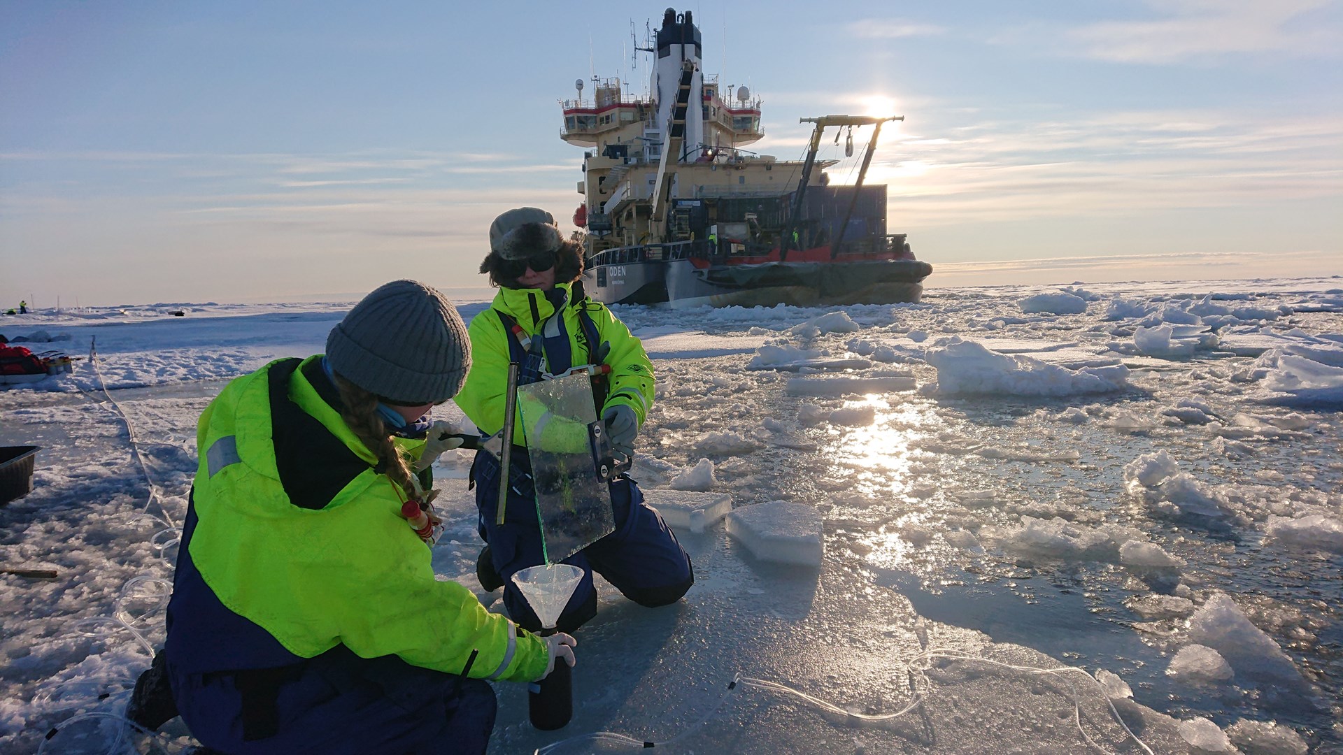 Sonja Murto (front) and Janina Rahlff sample microlayer with the glass plate sampler at the ice edge behind icebreaker Oden. Photo: John Prytherch.
