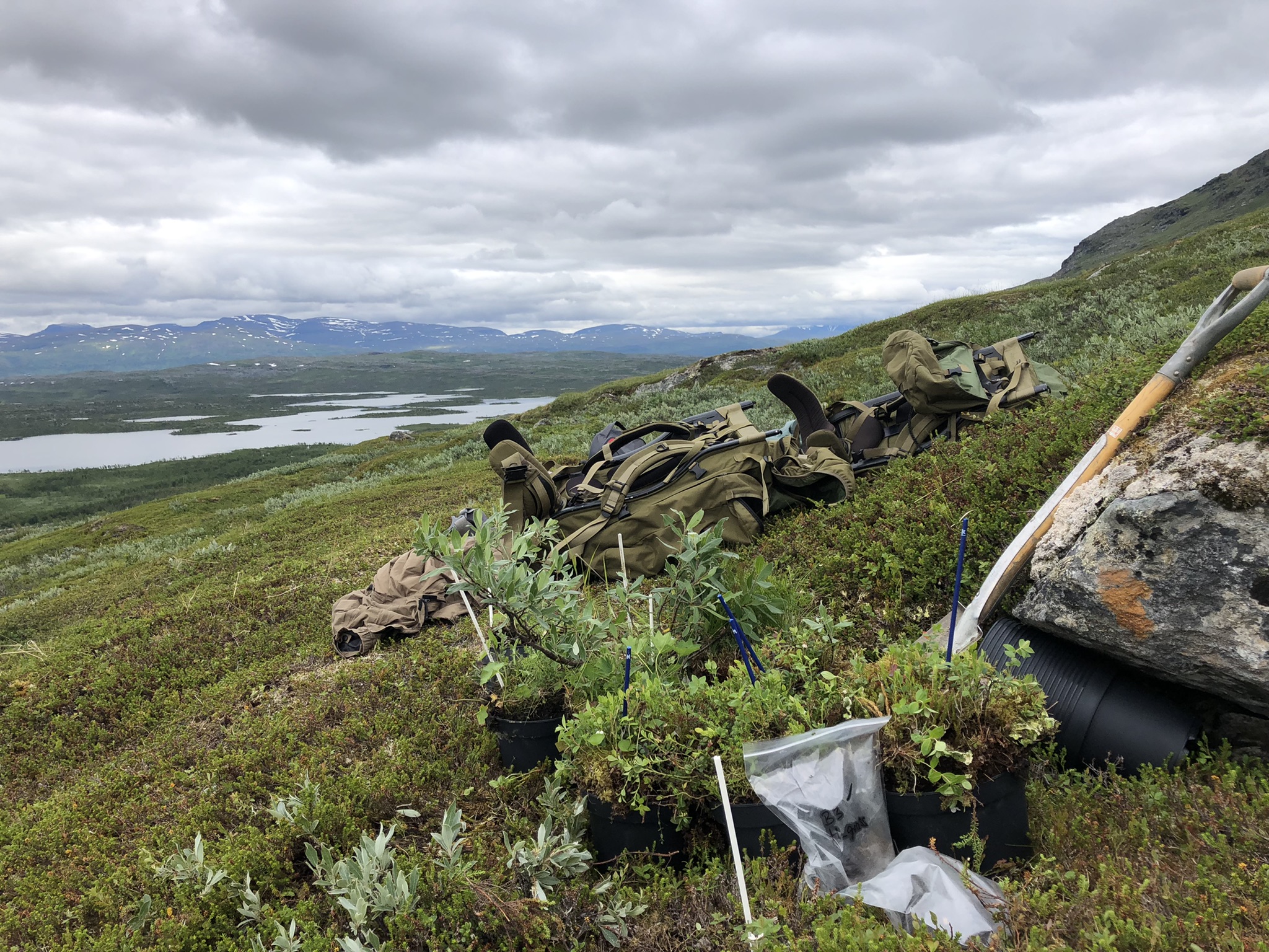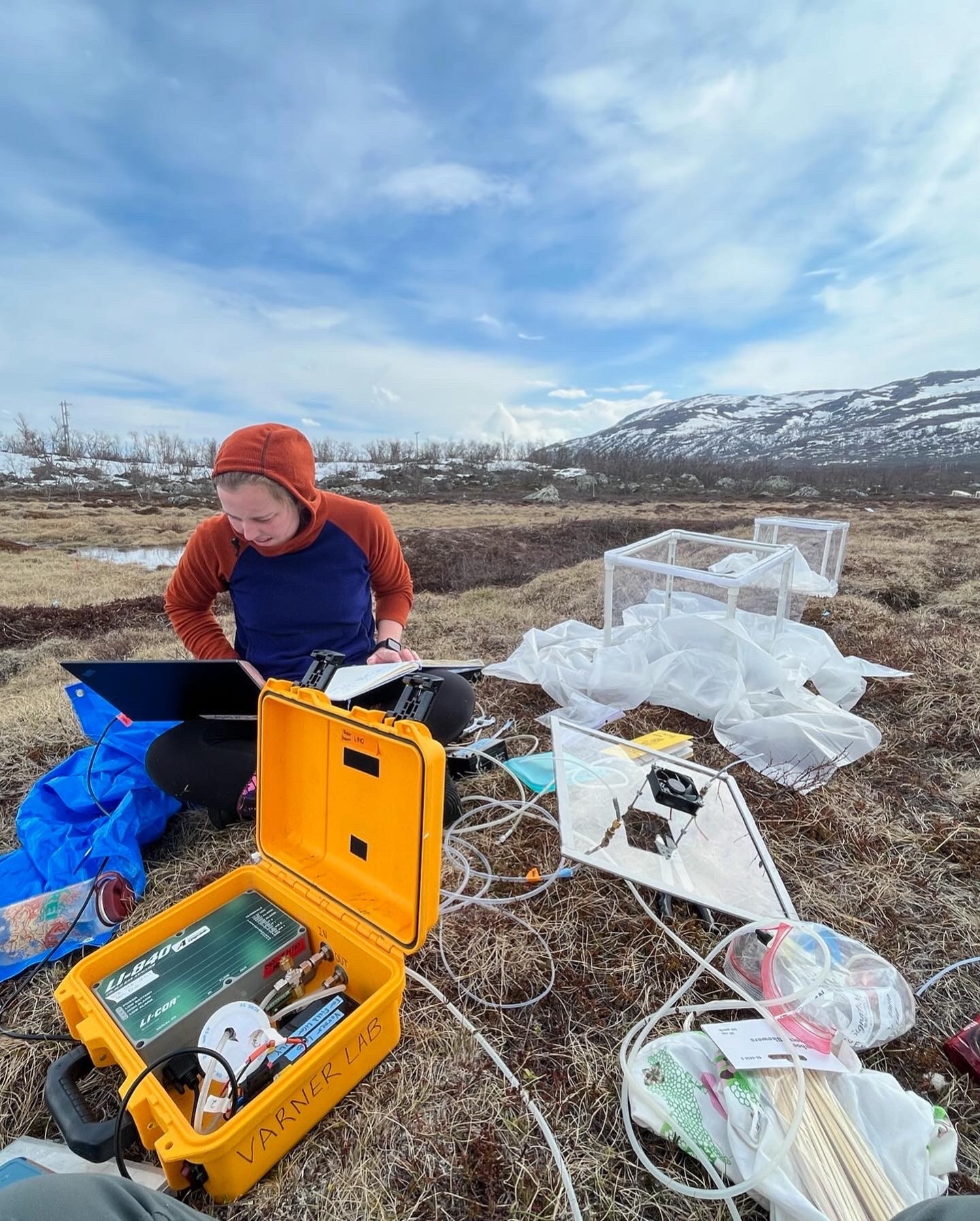 Undergraduate students hard at work in the Stordalen mire, collecting data for ongoing and new research projects, including methane and carbon flux measurements and vegetation quantification. Photo: Hannah Holland-Moritz
