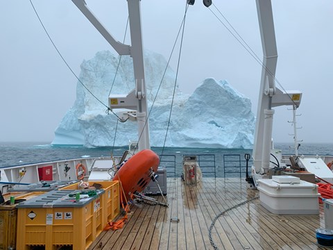 Today the sun is gone. We spent the day crawling through thick fog and dodging huge icebergs (very slowly!). As we write this in the mess (the dining area), the ship is rolling on a rough sea. Today the morning shift deployed CTDs, nets, and took water samples across the mouth of Kangerlussuaq fjord again to see if the recent storm has affected the water properties that enter the fjord. The afternoon shift prepared the mooring for deploying tomorrow, by attaching instruments to the rope in the pouring rain and fog while we passed by massive icebergs.