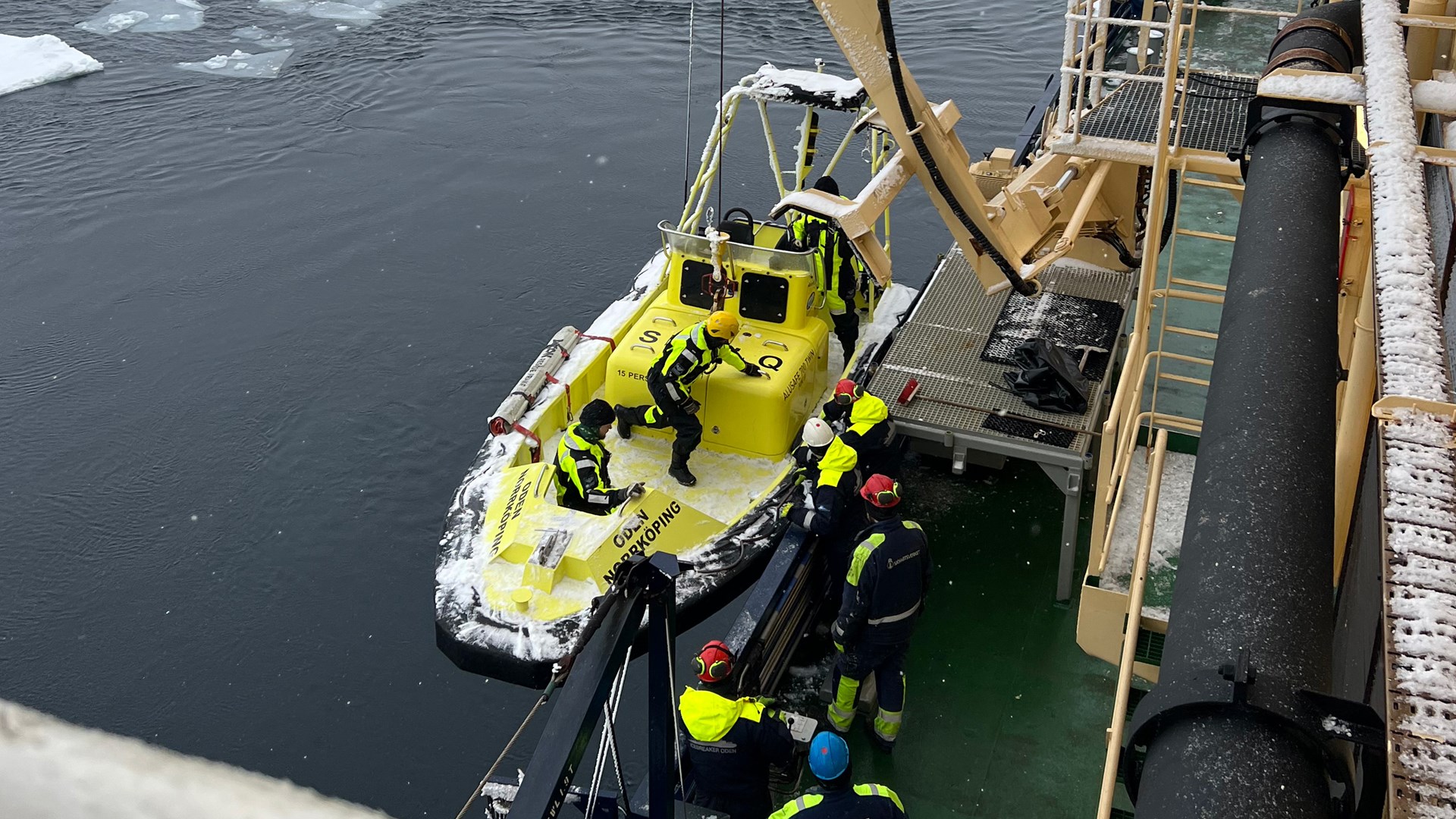 To ensure a successful launch, a small boat was used to extend the 125-meter sensor line. The lander with its weight was lowered from Oden’s rail at the same time as the sensor line was deployed from the small boat. This was a high-precision marine operation carried out by the Swedish Polar Research Secretariat’s technicians and Oden’s crew.