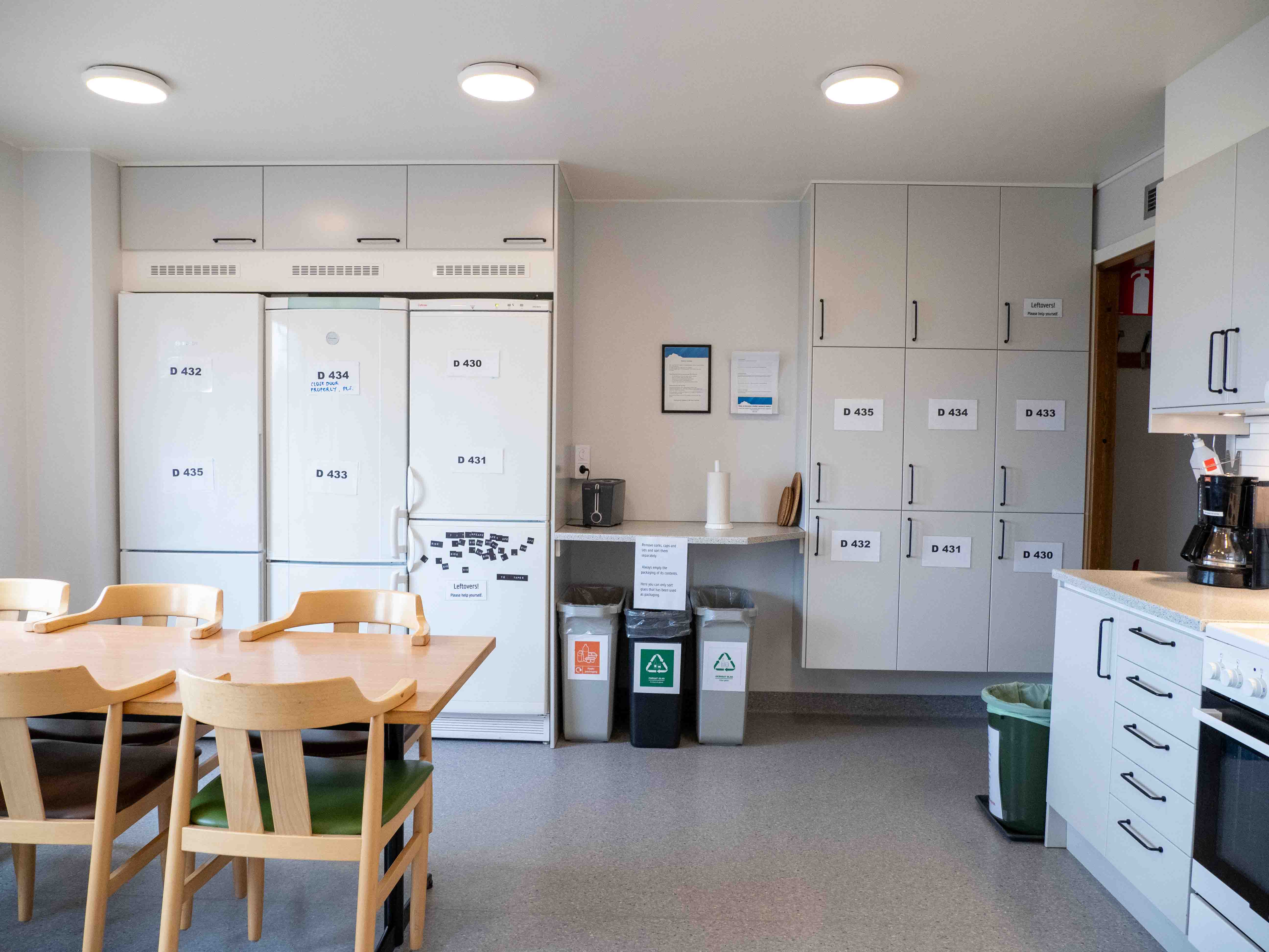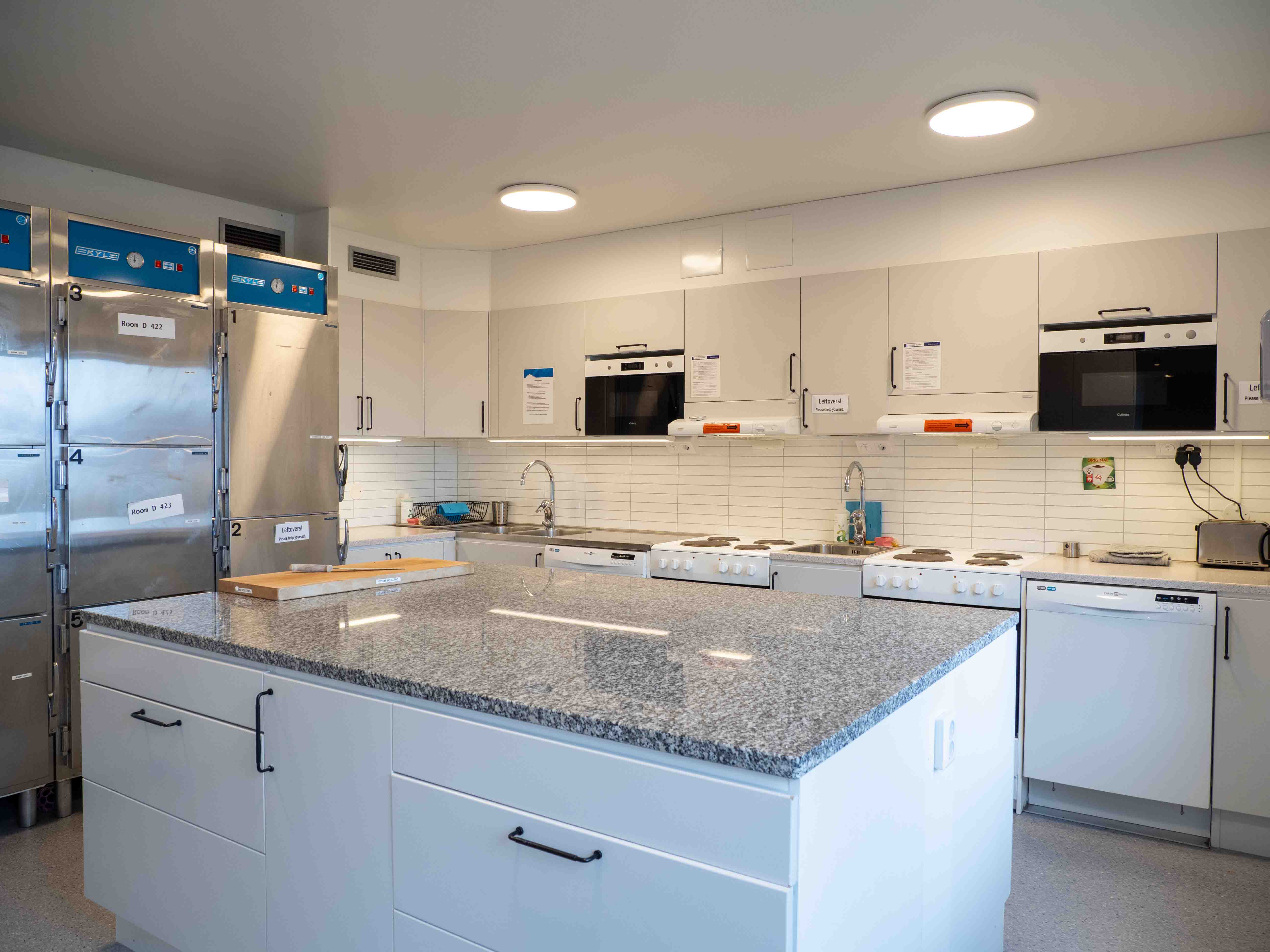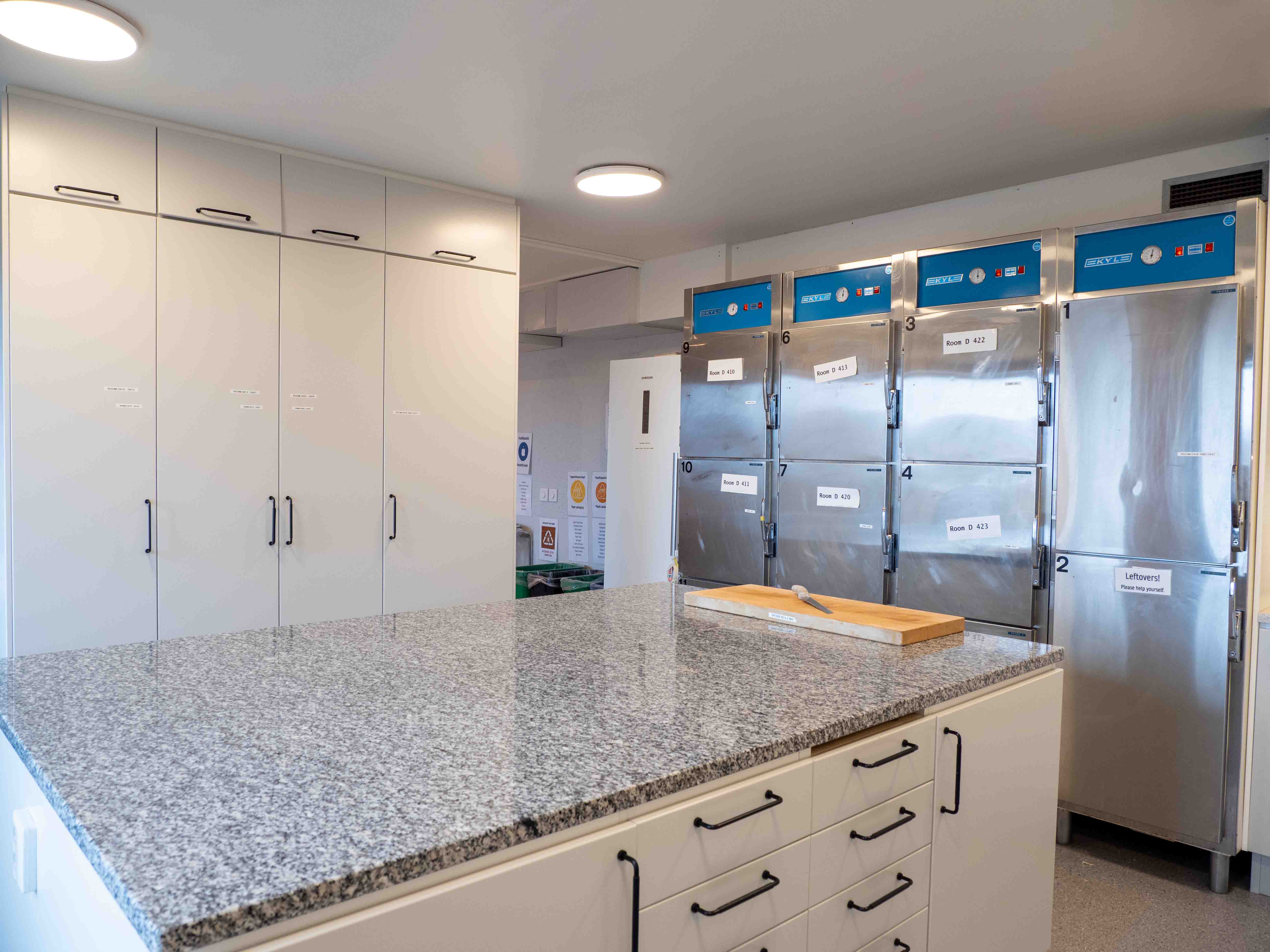 - There are two shared kitchens in the corridor for self-catering, one on each floor. You have access to a pantry, fridge and freezer.
