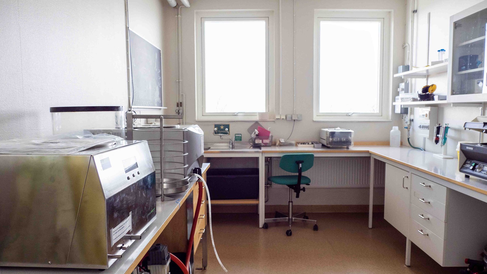 This smaller laboratory has three workbenches where samples can be processed for transport or analysis. Here is a blackboard for coordinating activities. The laboratory has a sink.