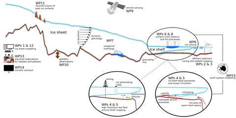 This theme addresses scientific questions focused on predicting the future evolution of ice shelves, understanding the melt- and freeze processes occurring in the ice-ocean boundary layer, and how they relate to the steering of intruding water masses caused by local bathymetry and/or ice shelf basal topography, and ice catchment dynamics.
