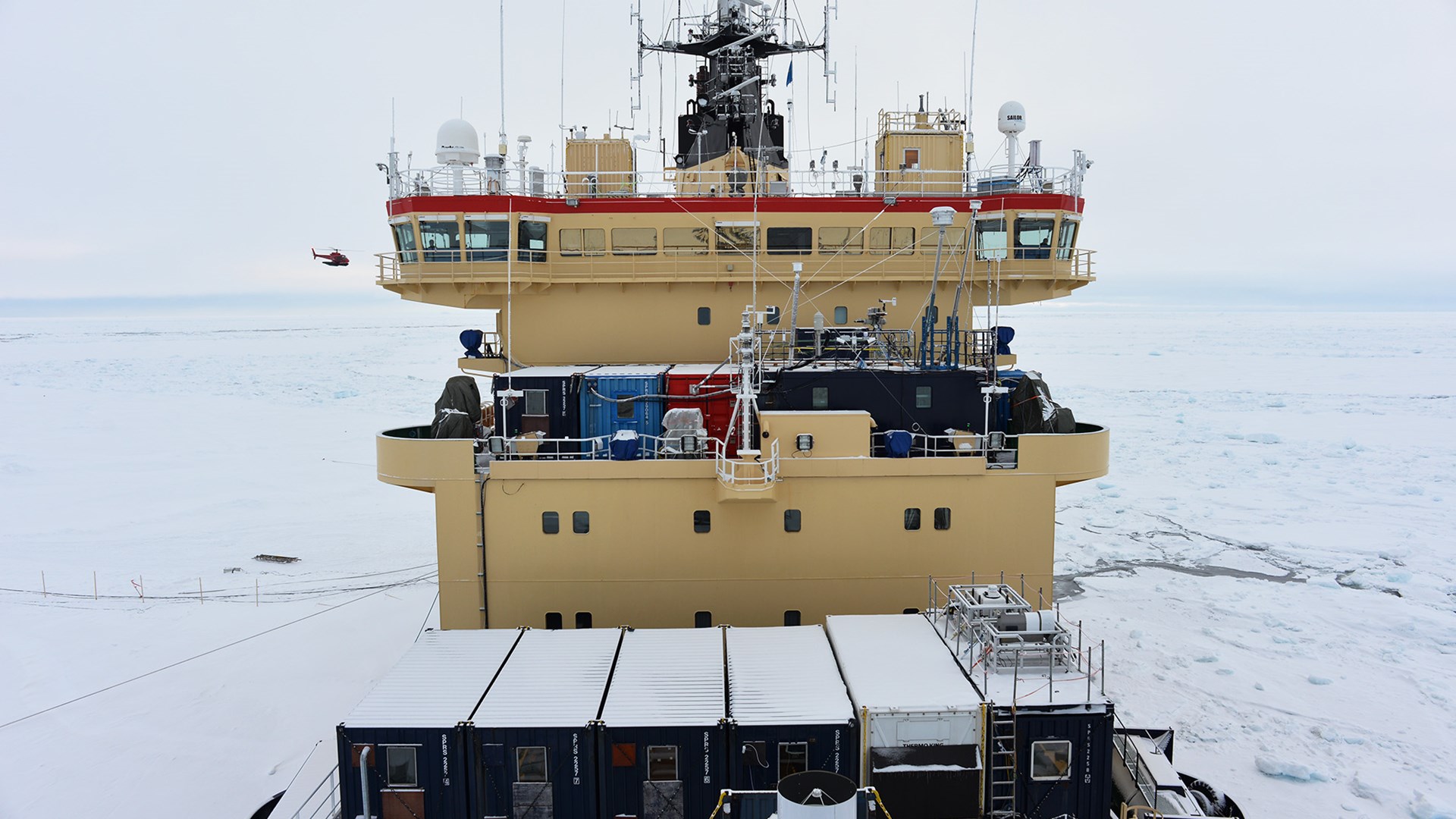 Vår arbetsplats var framför allt på Odens fjärde däck. Den röda schweiziskska containern med laboratorium till vänster om aerosollabbet där våra instrument fanns. Foto: Paul Zieger
