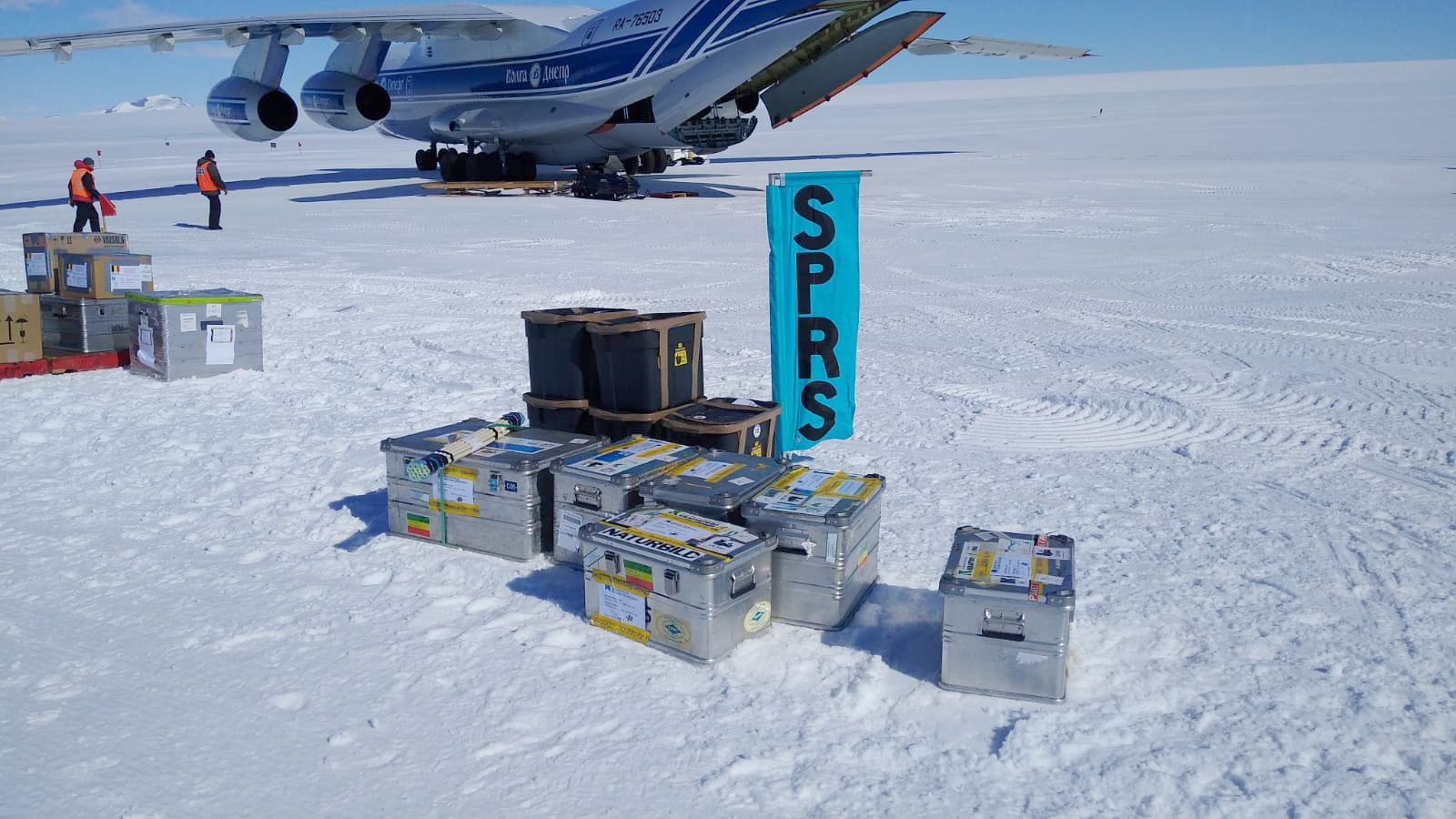 En del av expedionsutrustningen anländer med flygfrakt till den ryska flygplatsen Novo i Antarktis. Här packas allt om till mindre flygplan för vidare transport till Wasa.
