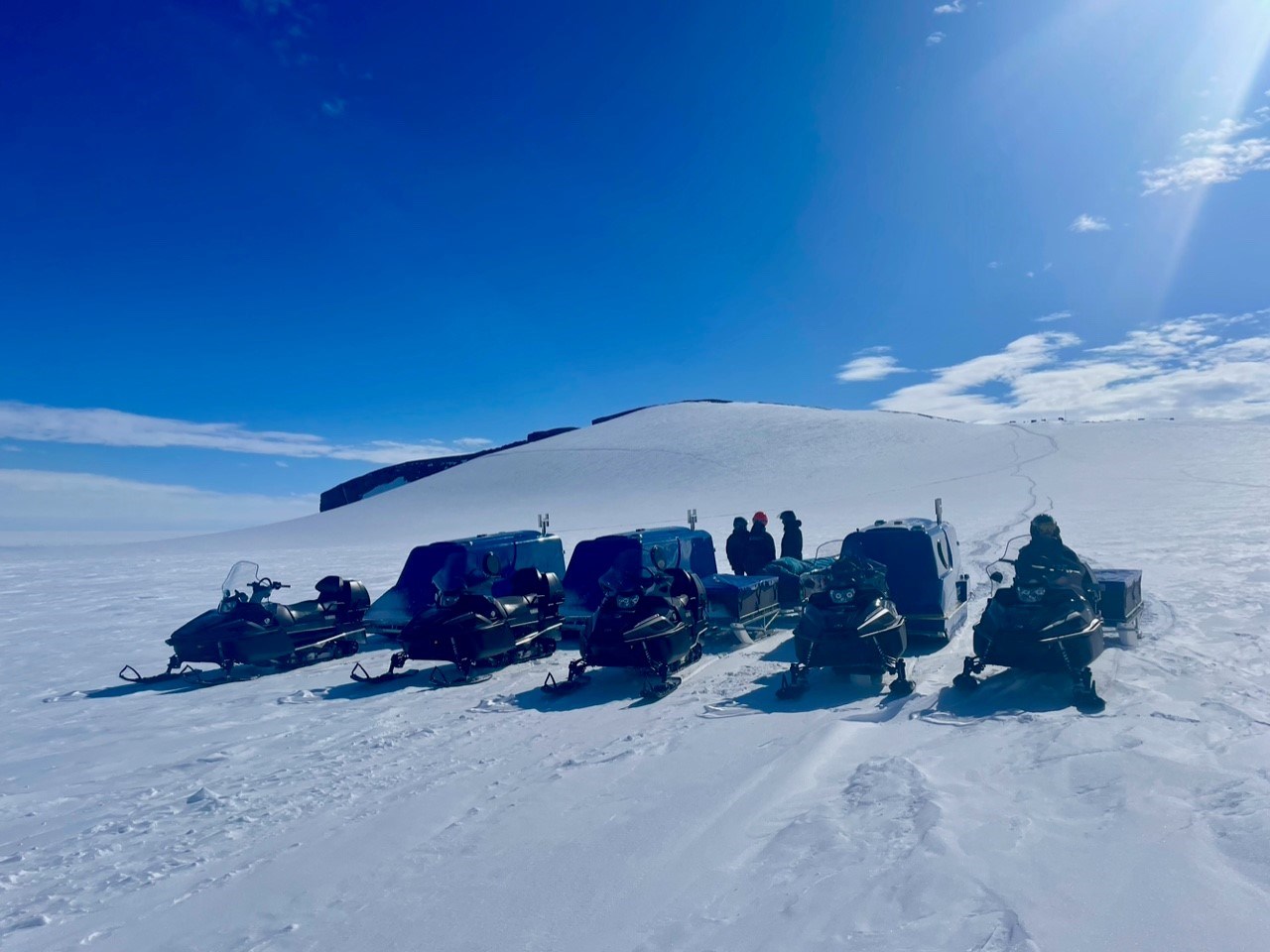 Vi kör alla skotrar som antingen drar arkar för boende eller en släde med utrustning, bränsle och mat. Vi är packade för att vara borta en vecka, med marginal med hänsyn till väder och ändrade förutsättningar. Förflyttningen sker i finväder, men de dryga tolv milen tar nästan hela dagen då man inte kan köra fort över vindpinad skare. På kvällen slår vi läger vid Finnefjella, en lite nunatak omsvävad av häckande ispetreller som inte är ett dugg intresserade av våra arkar och vårt färgglada toatält. Vi gräver ner maten i en låda i snön, tänder i kaminerna och smälter vatten innan vi somnar i våra dunsovsäckar.
