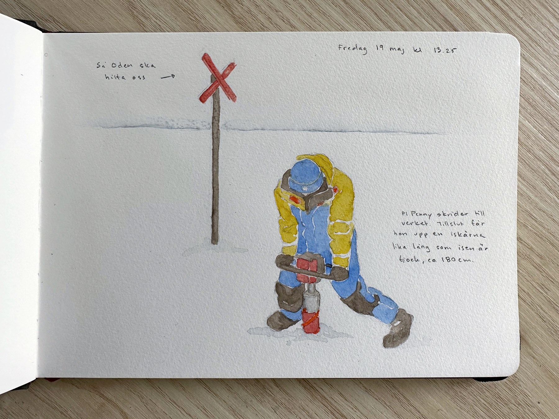 Efter lunch slår jag följe med Penny. Anropar Bryggan: ”ice control, ice conttrol, number 52 on ice”. Vid landgången går en blå, nybildad spricka. Oden, som trycker sina stabila styrbordsida mot iskanten, håller vår bakgård samman. Vi går bort till det närmsta hörnet av flaket och Penny skrider till verket. Hon borrar och det är ett tungt arbete. Tillslut har hon fått upp en iskärna lika lång som isen är tjock, 180 centimeter. Jag hjälper till att anteckna de olika mätningarna. Isens temperatur vid olika djup (och annan data som jag inte minns eftersom allt benämns i akronymer).