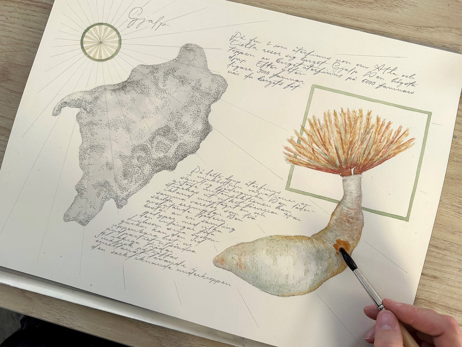 Morgonen börjar med sol och forskarna är ute vid sina stationer. I min container tecknar jag på en ny undervattensö, som har Gjalp som sin högsta topp. Den ligger strax norr och Atla och Eistla. I mjukbottnen kring Gjalp finns variationer av skrovlig fjädergurka. Den läderartade mittensektionen av denna varelse kan sträckas ut och bli närmast ormlik. Från dess inre sticker fjäderlika spröt fram, vilka består av en samling polyper som används för att insamla föda. Denna märkliga skepnad tillhör djupvattnet och kan mycket väl existera i närheten av Gjalp (sanning är ett undflyende begrepp).