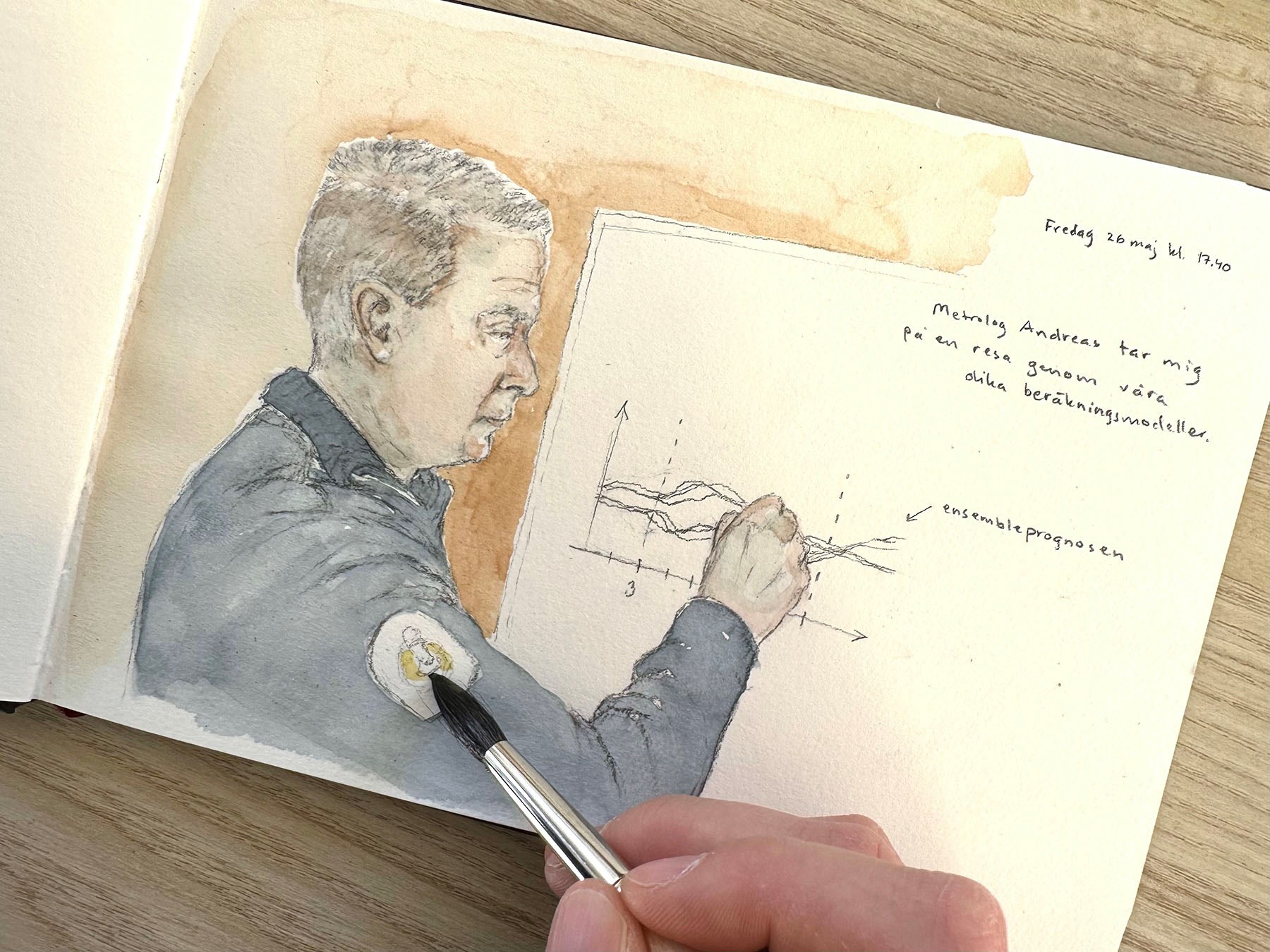 Annars har jag haft näsan i böckerna. Jag har bland annat påbörjat Constantine John Phipps dagbok från resan mot nordpolen år 1773. Strax innan middag läser jag hans inlägg från 13 juni där han beskriver svårigheten i att göra mätningar som anger skeppets exakta position. Tillslut får han återgå till äldre tiders räknesätt och genomför tre mätningar av månen och solen för longitud och en tillämpning av ”död räkning” för latitud. Han tar sedan de olika beräkningarna och finner ett genomsnitt som blir den definitiva positioneringen av skeppet. Hela denna skrivelse får mig att tänka på de metrologiska modeller som tillämpas ombord på Oden. Så jag tar trapporna upp till Bryggan där metrolog Andreas hörsammar min frågvishet och tar med mig på en resa genom våra olika beräkningsmodeller. Han ritar diagram och beskriver ensembleprognosen som bygger på genomsnittet av 62 olika mätningar men där problemet är att den matar ut en absolut sanning. För att kompensera tillförs små defekter i form av exempelvis ett felaktigt lufttryck. Han berättar även om väderballongerna vi sänder ut, och om Enok Sarri som förutspådde vädret genom att tyda fiskarnas maginnehåll. Vi får dock ta en paus i föredrag vid 17.15, då jag lovat att teckna ytterligare en isbjörn på en väderballong. Theresas vän ska gifta sig.