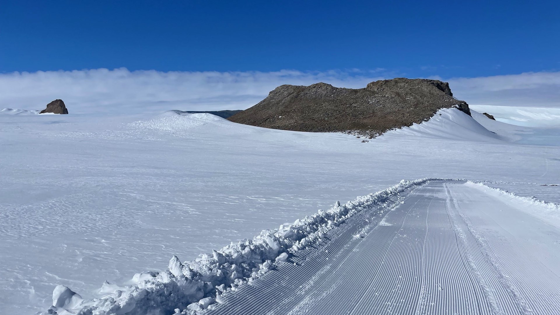 Igår fick vi dock ett välkommet avbrott i stormen. Vaknade av att tältet inte skakade. Vinden var fortsatt frisk men utan snödrev och himlen klaraste blå, temperaturen torra -10°C. Windy-appen visade att vi befann oss i en fridfull oas av finväder, precis utanför ovädret. Således fortfarande inte möjligt att flyga mot Wasa men möjligt att ta sig utanför tältet för att sträcka lite på benen! Iklädd varma löpkläder, isdubbade skor, och en radio i bakfickan följde jag det snitslade glaciärsäkrade spåret mot närmaste nunatak. Planen var en tur och retur men till min lycka kom jag upp i ett pass mellan två toppar och kunde runda ner på baksidan av berget. Kunde därför springa hem via en annan väg än den som ledde dit och avslutade turen via den isiga landningsbanan vi anlänt på i början av veckan. Känslan var lite som när Rocky springer upp mot monumentet i Philadelphia till tonerna av soundtracket i Rocky IV. Fick till 10 km på utmanande underlag med bitvis blåis och bitvis mjukare pist. Kom hem med plågade lyckliga lår och ett stort leende som stod sig trots att dusch-containern var obrukbar eftersom rören frusit.