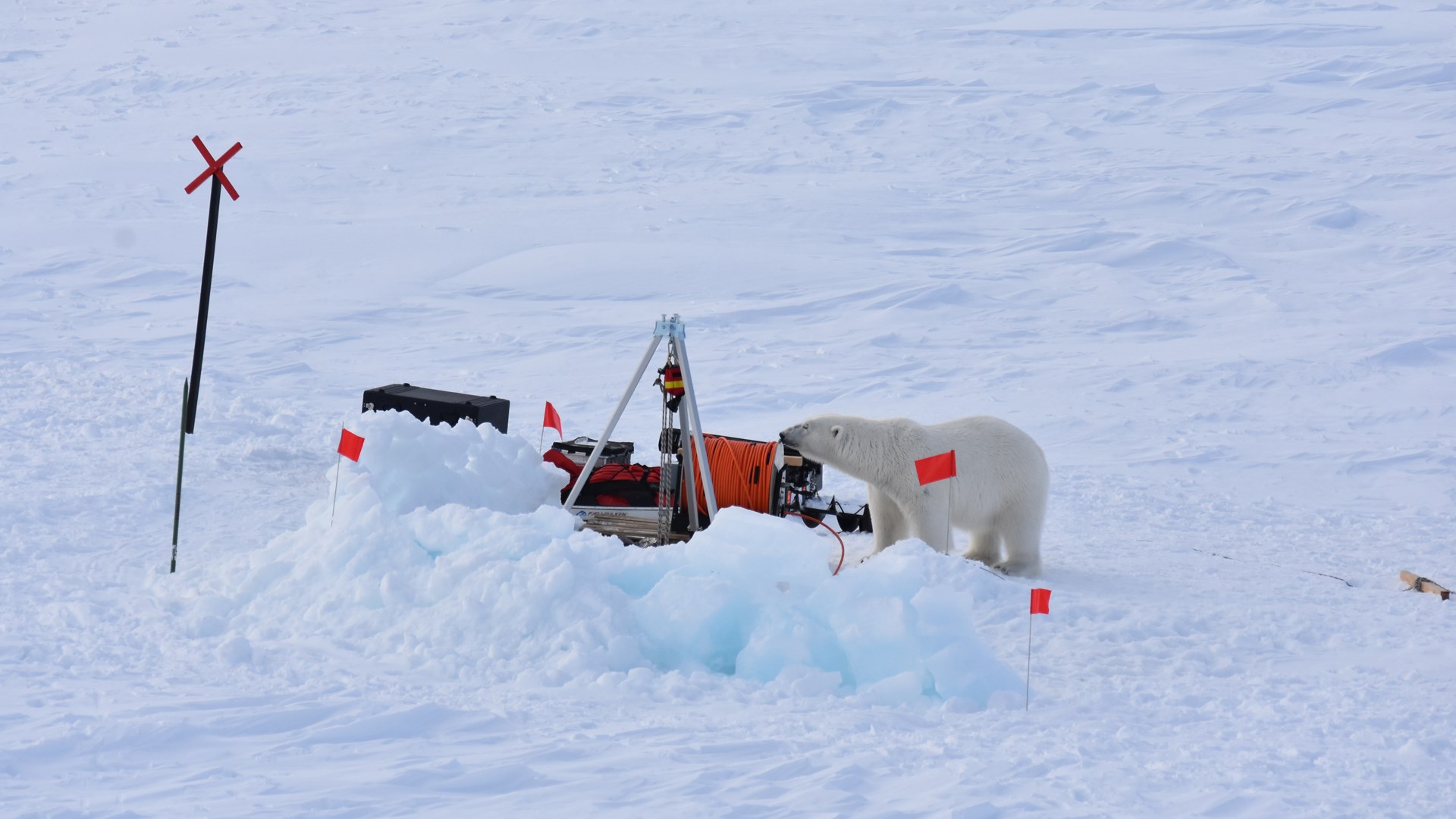 Dålig sikt innebär att det är farligt att vara ute på isen eftersom vi inte kan se om någon isbjörn närmar sig. De har en underlig förmåga att helt plötsligt bara dyka upp, oftast i vindriktningen från fartyget, troligen hitlockade av våra dofter. Häromdagen hade vi ett fint björnmöte där en hanne dök upp 5 minuter efter att alla kommit ombord efter dagens isarbete. Björnen gick och nosade på alla instrument som står monterade på isen, rullade sig i våra fotspår, tuggade på lite röda flaggor och funderade på att ta sig en tur med snöskotern.