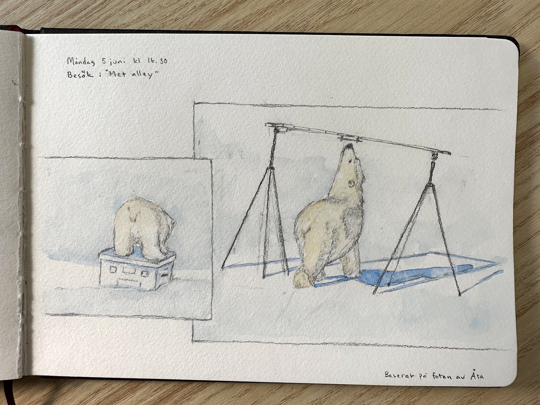 Klockan 16.00 är Oden ute och kör, vi ska vända på oss. Forskaren Paul har en önskan om att fören alltid ska vara riktad mot vinden, så att inga föroreningar ska komma in i mätinstrumenten. Vinden har vänt. Bredvid oss går en nyfiken isbjörnsmamma med sin unge. När vi kommer för långt bort, börjar björnsfamiljen traska tillbaka mot vårt isflak. På avstånd ser vi hur snöskotrarna inspekteras. Sedan ”Met Alley” och Philipps ROV-station. Men det är Theresas instrument som råkar illa ut. Det är ett instrument som mäter aerosoler, med delar som rör sig och avger surrande ljud var 50:e sekund. Honan, som nog finner konstruktionen spännande, balanserar på en metallåda. Den välter och drar med sig hela ställningen. Även några träskyltar som markerar de olika stationerna rivs ner och den lilla ungen ligger och leker med den färgglada biten av en buoy. Värst går det för Johans snöskotrar. Båda sätena får spår av björnens rejäla labbar. Men det är nog rätt coolt ändå, att ta med isbjörnsmärkta skotrar hem till Jämtland.