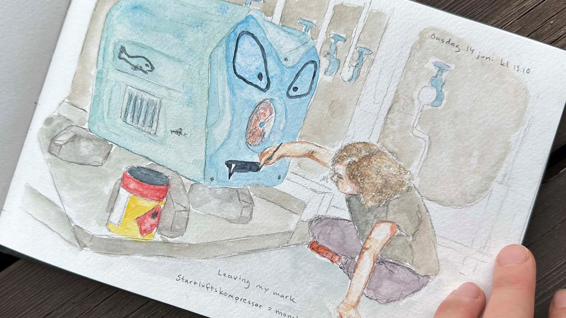 Det känns att tiden ställdes om två timmar under natten. Somliga väljer att ta sovmorgon. Själv har jag ett hektiskt schema. Jag ska måla maskinmonstret. Efter frukosten söker jag upp Christer som tar mig ner till startluftskompressorn så att jag kan mäta ytorna. Jag går sedan upp till containern och förbereder några mallar. Därefter, ner till maskinerna igen. I rummet bredvid hittar jag motorman Richard som tycks vara i sitt rätta element – spelar musik medan han svarvar på ett nytt verktyg. Jag hämtar färgbyttan på bordet intill och skrider sedan till verket. Det blir ett ilsket litet maskinmonster som får sällskap av en fisksalamander av något slag. När förstemaskinist Johan kikar förbi tycker han absolut att jag måste signera verket. Efter att signaturen kommit på plats tar han mig på en rundtur bland maskinerna, som går för fullt. Jag tackar aldrig nej till en rundtur. Den första fick jag av kapten Mattias under mobiliseringen i Helsingborg. Den andra rundturen gav Richard. Det här blir den tredje. Alltid finns det nya saker att upptäcka, just eftersom det är olika personer som berättar.