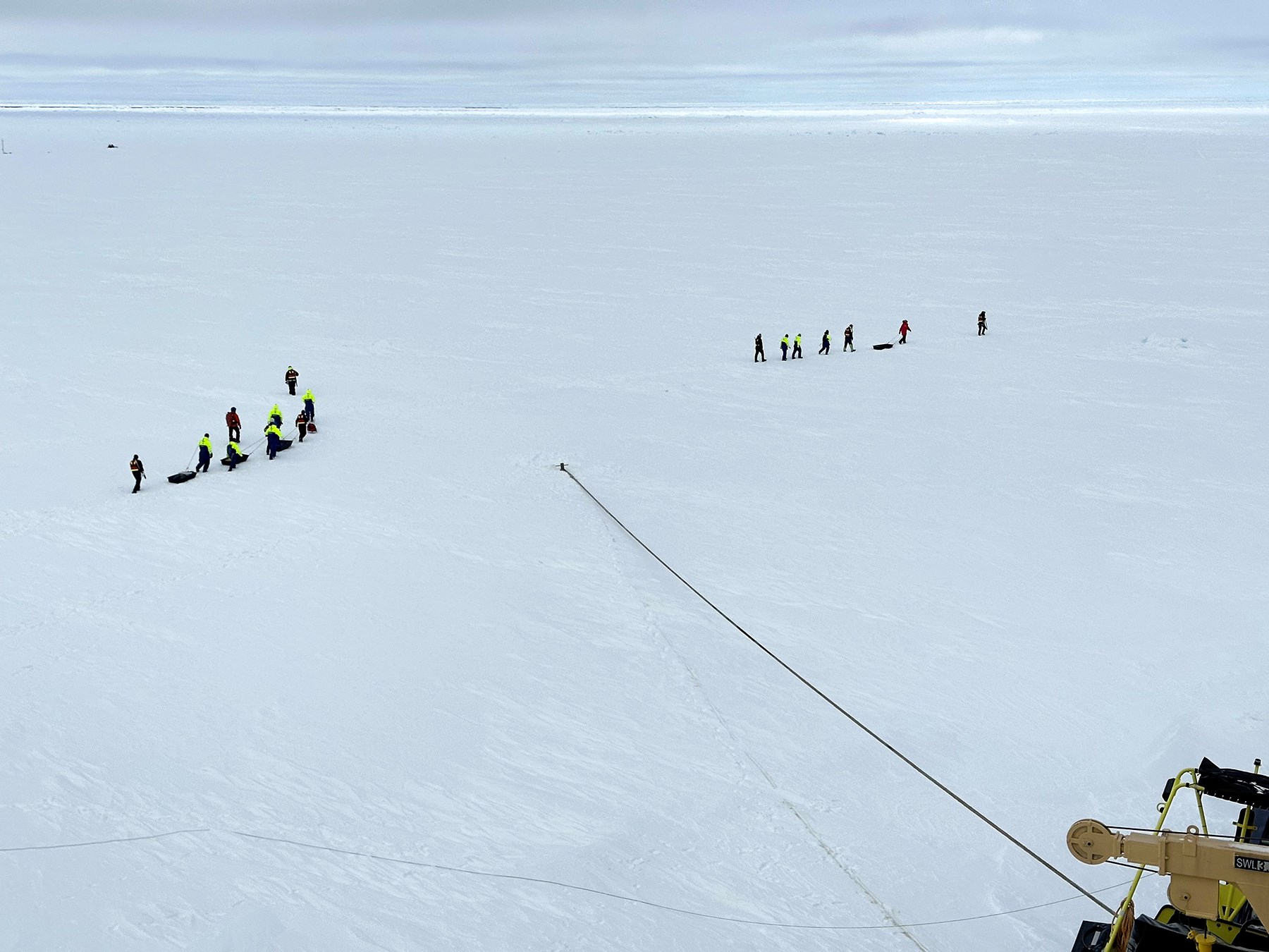 På morgonen står jag på fjärde däck och ser hur forskarna lämnar Oden. Det ser speciellt ut när de rör sig ut över isen. Som ett lämmeltåg – eller som Paul beskriver det, en eskortering av fångar – går de i led med en isbjörnsvakt i täten och en på slutet. Vi får inte lämna båten utan beväpnade vakter och alla rörelser rapporteras med radion upp till Bryggan: ”ice-bridge, ice-bridge, xx on ice, gun loaded.” En fångtransport, en månlandning, en vandring över öken där sanden ligger som kompakta lerkakor, eller en exkursion ut på ett isflak.