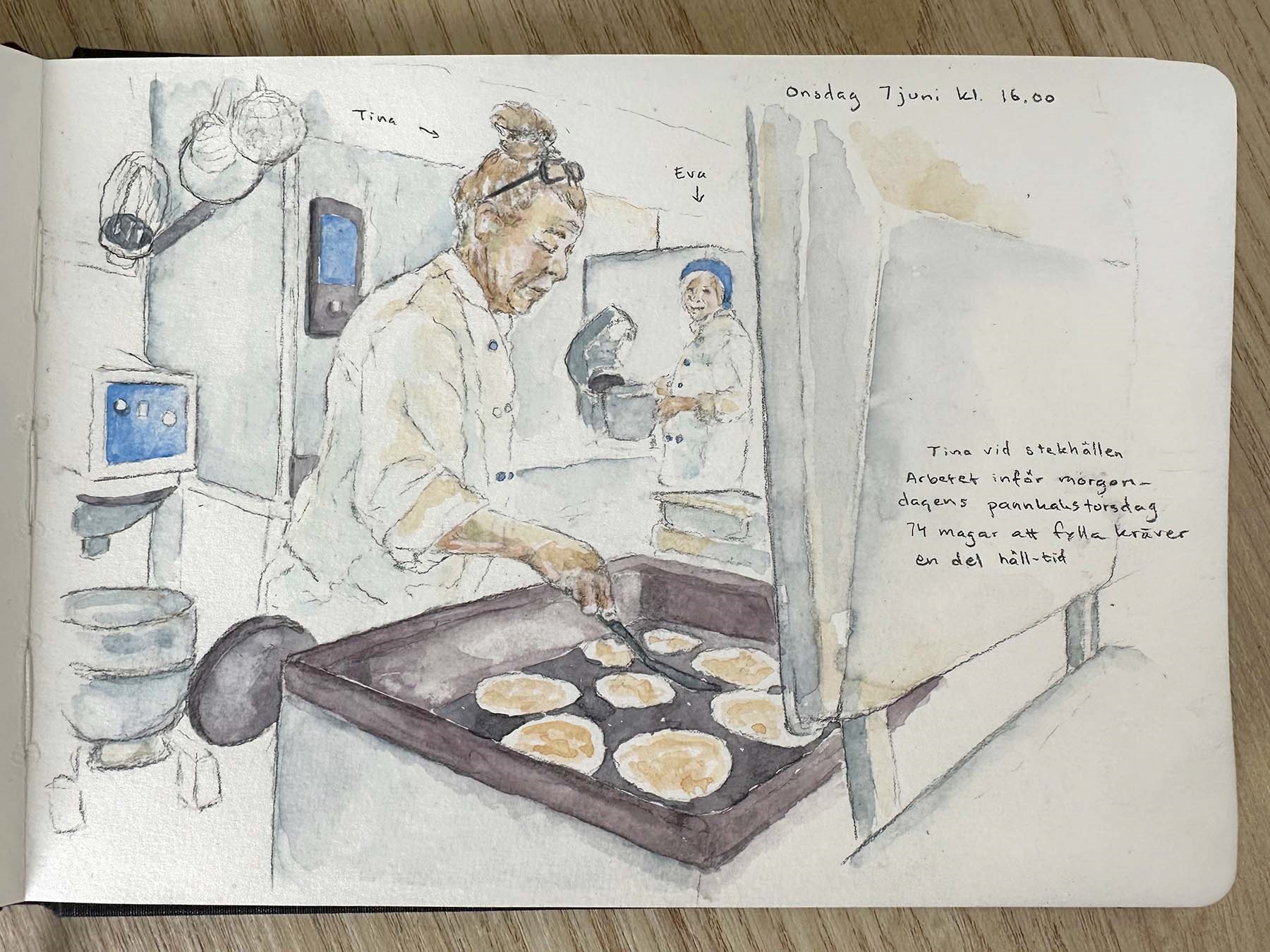Klockan 16 kikar jag in i byssan och får en inblick i Tina och Evas vardag ombord på Oden. Tina gräddar pannkakor på hällen. Det blir ett gäng att grädda när 74 magar ska fyllas. Torsdagens pannkakor påbörjas därför redan under onsdagen. Och då slår det mig, detta blir vår sista pannkakstorsdag.