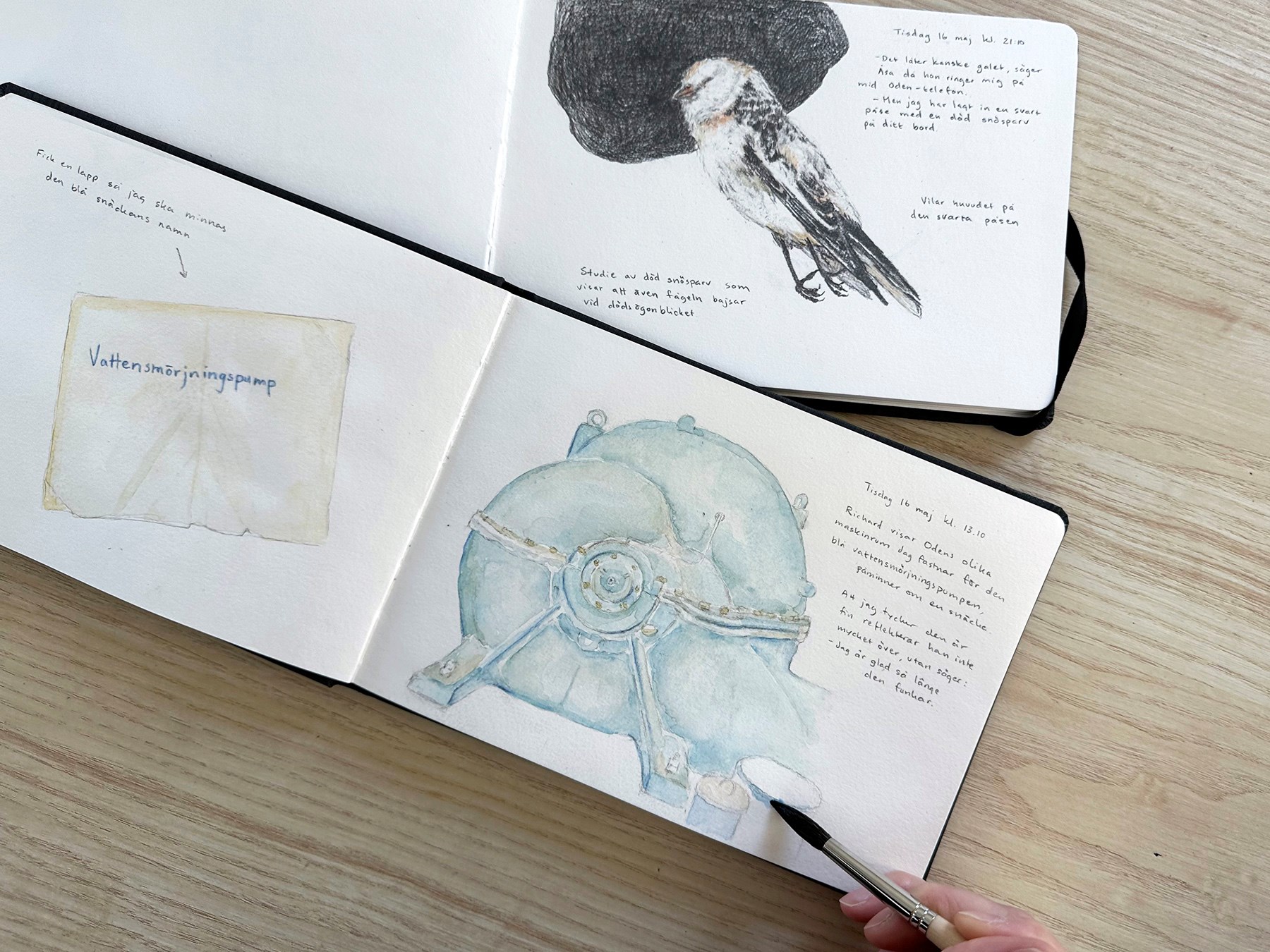 Åsa, vår samordnare ombord, ringer mig under dagen. Hon har lite svårt att veta var hon ska börja: ”Jo, det låter kanske lite konstigt, men jag har lämnat en svart liten soppåse på ditt skrivbord. I den hittar du en död snösparv. Vi såg den flyga omkring tidigare, men sedan hittade vi den död. Jag tänkte att du kanske ville ha den.” Jag blir lite full i skratt, också rörd. Klart jag vill ha den. Så medan forskarna gör sina viktiga insatser och besättningen gör så att vi överlever och tar oss fram, sitter jag och tecknar av snösparven som mötte döden på Oden. Jag vrider och vänder på den mjuka, lilla kroppen och noterar att inte bara människan tömmer sin mage vid dödsögonblicket.