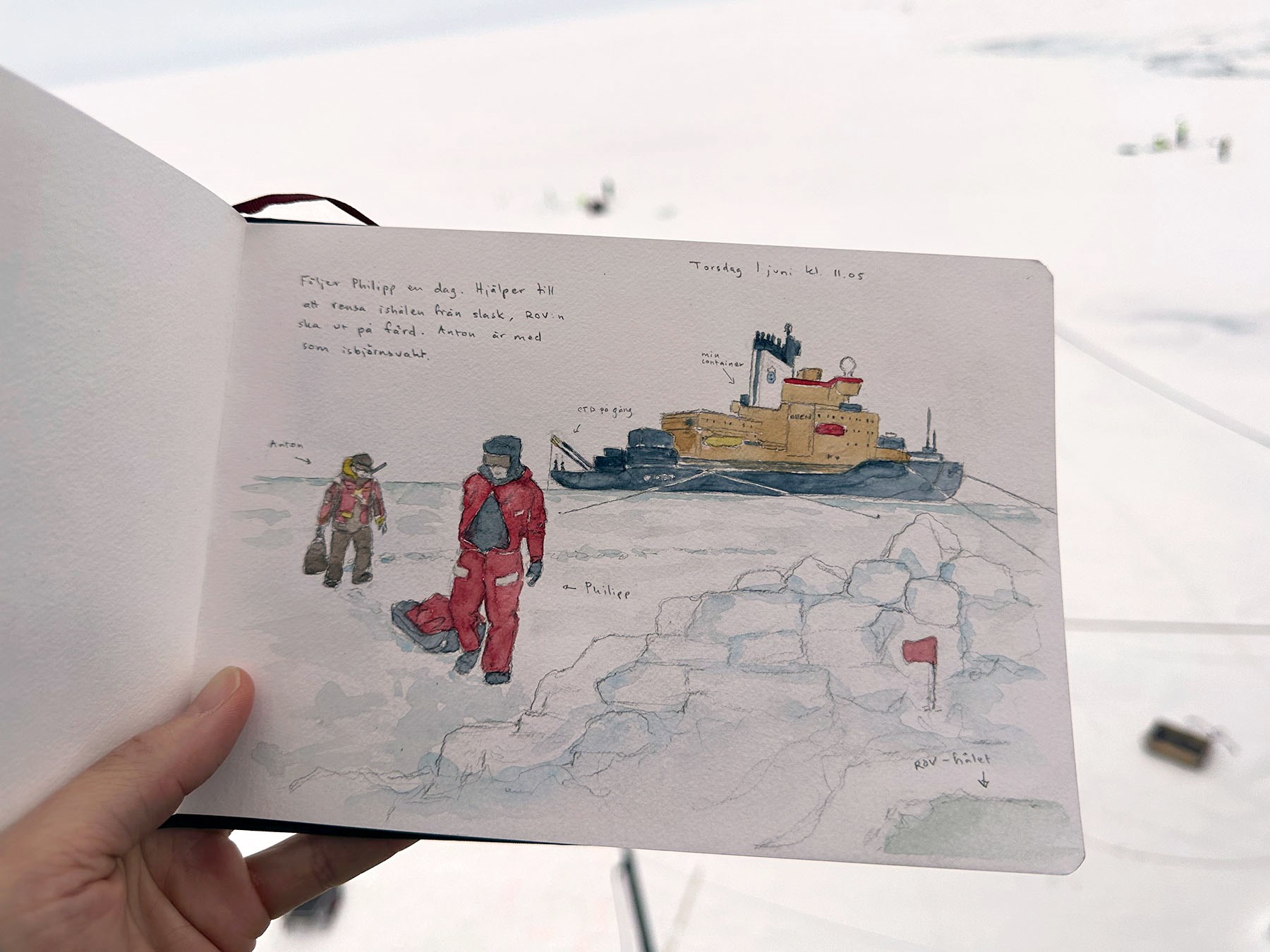Jag får assistera Philipp idag. Strax innan 11 anropar jag, ”ice control, number 52 on ice”. Vi går till den nya isvaken där ROV:n ligger under ytan och väntar på en simtur. Medan Jeff stannar vid hålet och börjar rensa den från slask, följer jag med Philipp bort längs raden av flaggor som märker ut var 10:e meter. Vid tionde flaggan stannar vi. Philipp borrar hålet lite vidare och jag rensar bort snö och slask som fallit ner. Vi hinner inte mycket mer innan det är dags för lunch.
