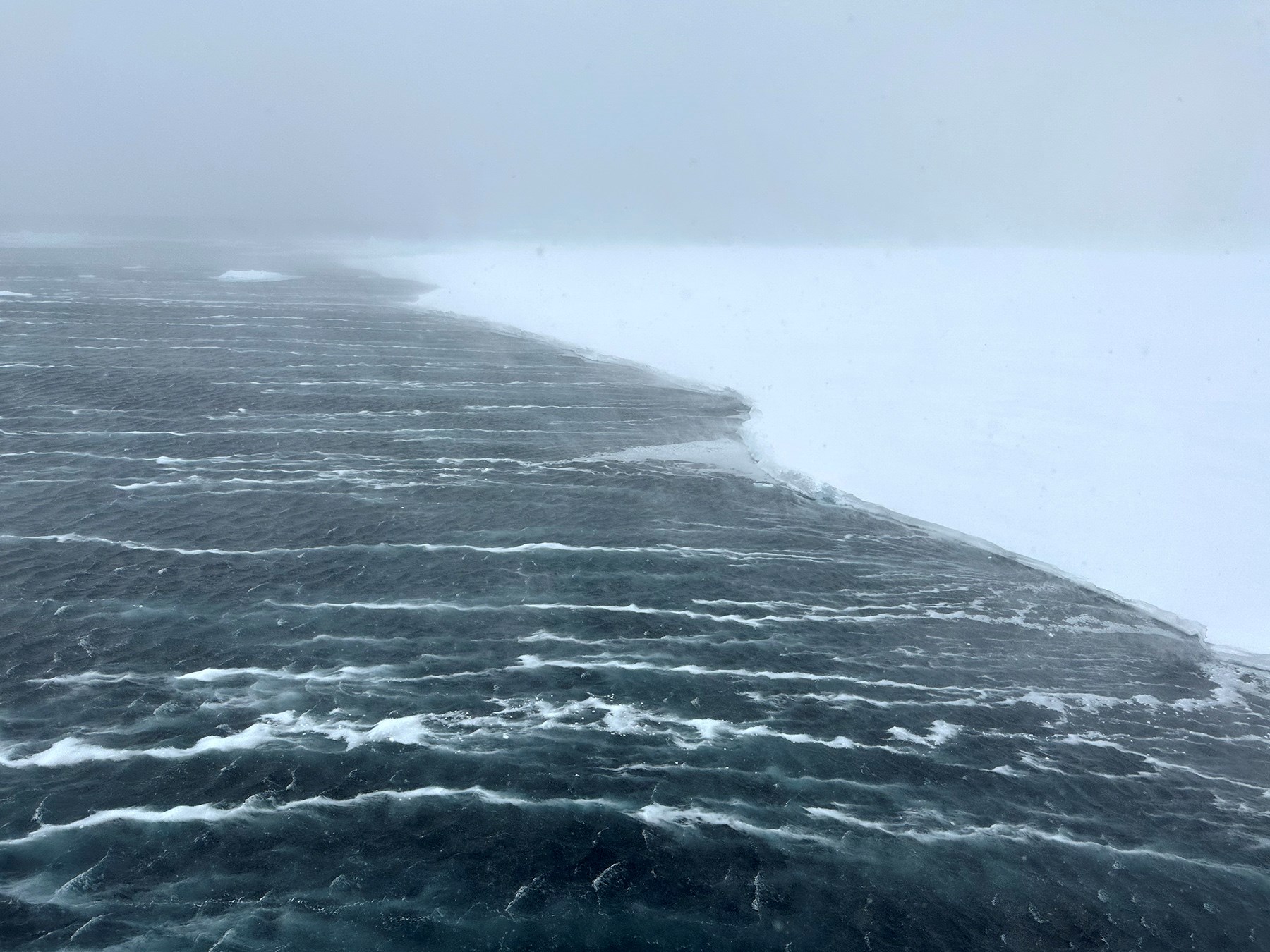 Vi är mitt i stormen. Med en vindstyrka på 21 sekundmeter ska vi möjligaste mån hålla oss inomhus. Min arbetscontainer står på läsidan, så jag utgör ett undantag och njuter denna stormiga dag i min plåthydda på fjärde däck. Genom mitt ena fönster ser jag isen. Där är enbart en rymd av vithet. Genom det andra fönstret ser jag havet och på den vilda svarta ytan ligger utdragna och ibland nedtyngda linjer av havsskum och is. De vita tycks röra sig i en egen tidsrymd, segt och långsamt vibrerande.
