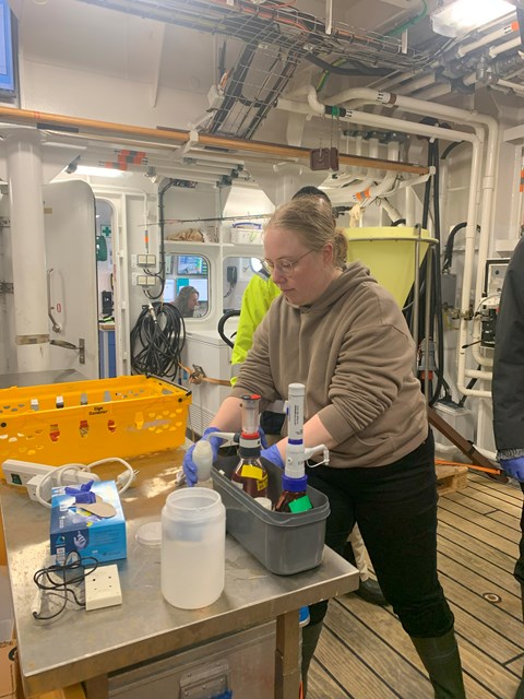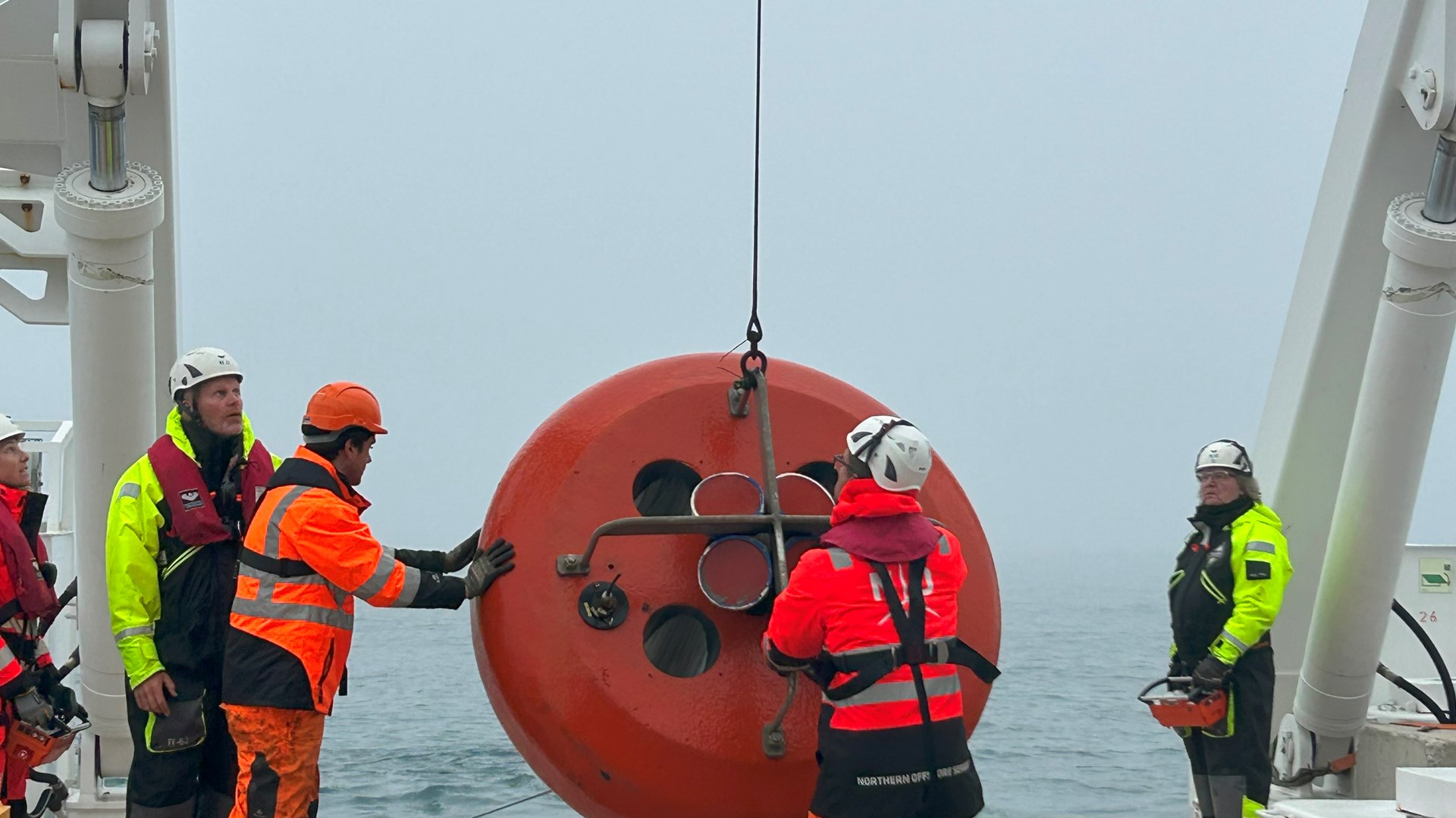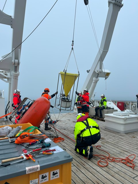 At 7PM we reached the mooring – the scientific instrument that has been measuring ocean properties for a year, and that we are here to service, and redeploy for another year. The fog had rolled in, and the ship was sailing slowly. We all waited with baited breaths to see if we could spot the mooring floating on the surface. At last – we found it! The team worked together to haul the scientific instruments on board and collect and safely store the samples.
