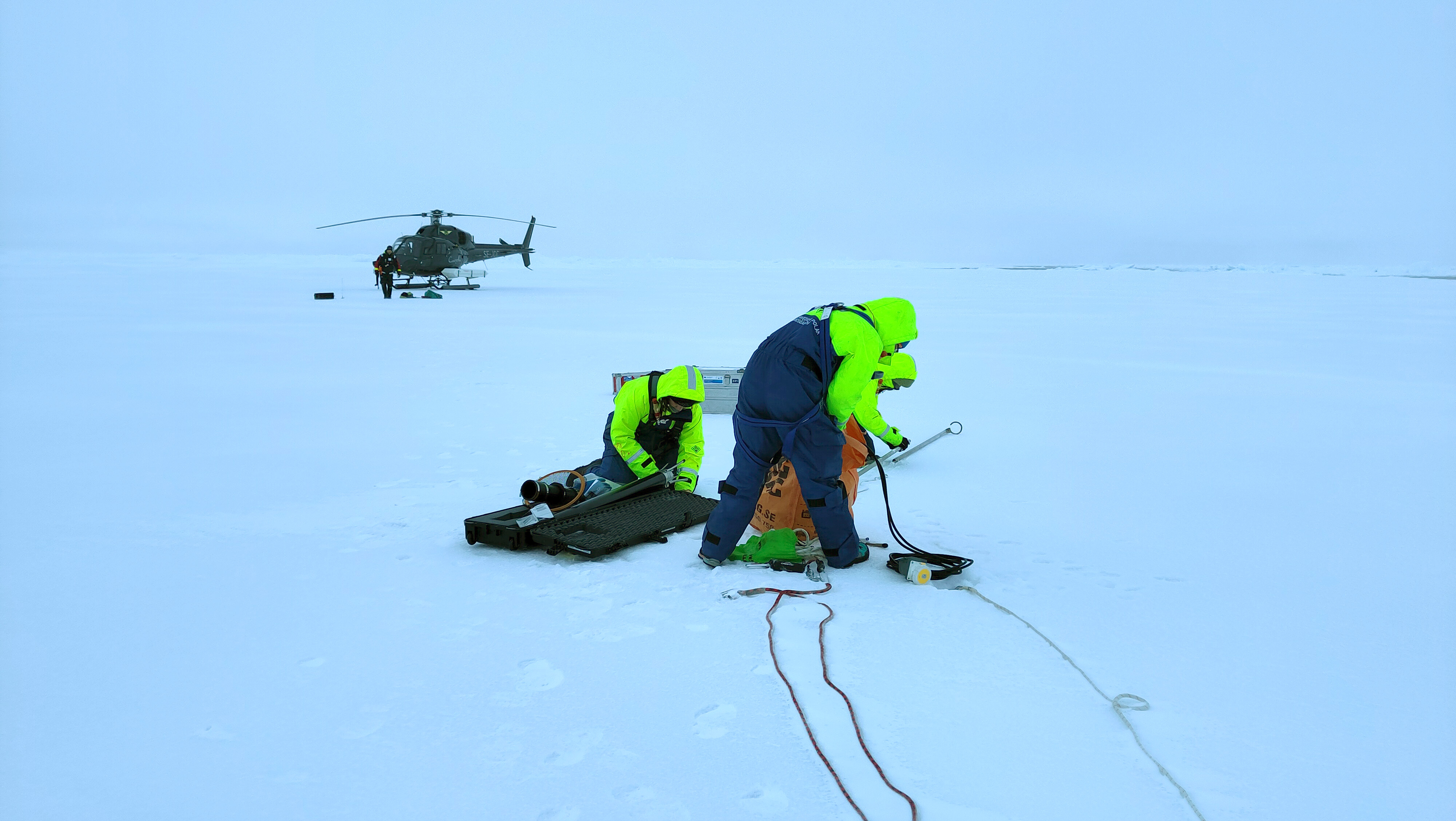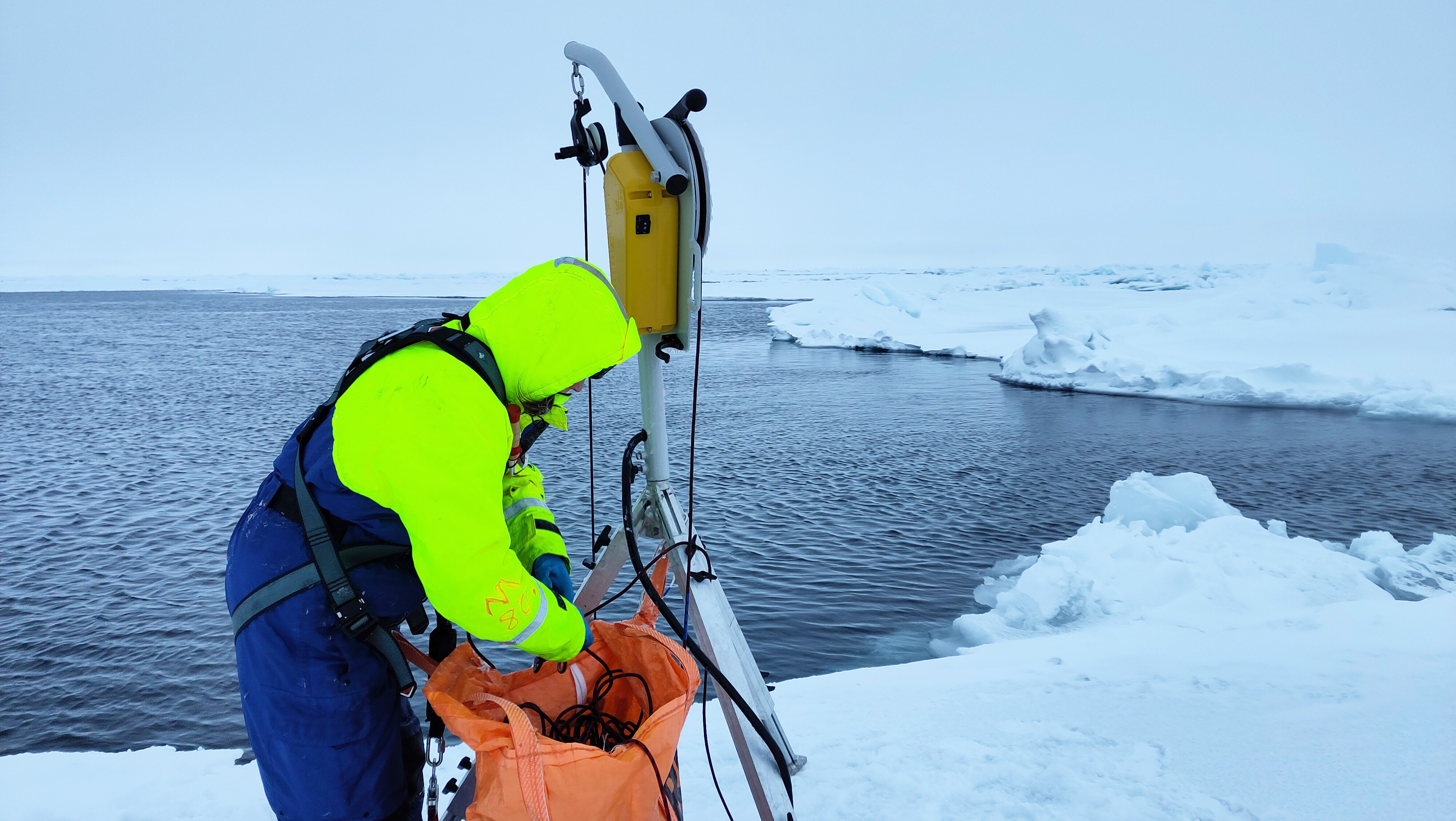 Lina och jag arbetade vid iskanten, säkrade med sele och lina som var fästa i en isborr några meter från kanten. Vi hissade ner en Vertical Microstructure Profiler (VMP), ett instrument som, med hjälp av superkänsliga sonder, mäter temperatur, salthalt och små variationer i vattnets rörelse (skjuvning) flera gånger per sekund. På så vis kan man undersöka varje centimeter av vattenkolumnen, ner till 500 meters djup, och förstå hur välblandade vattenmassorna är. Instrumentet måste falla fritt i vattnet, så linan får inte sträckas – vilket kräver att man arbetar snabbt och fokuserat.