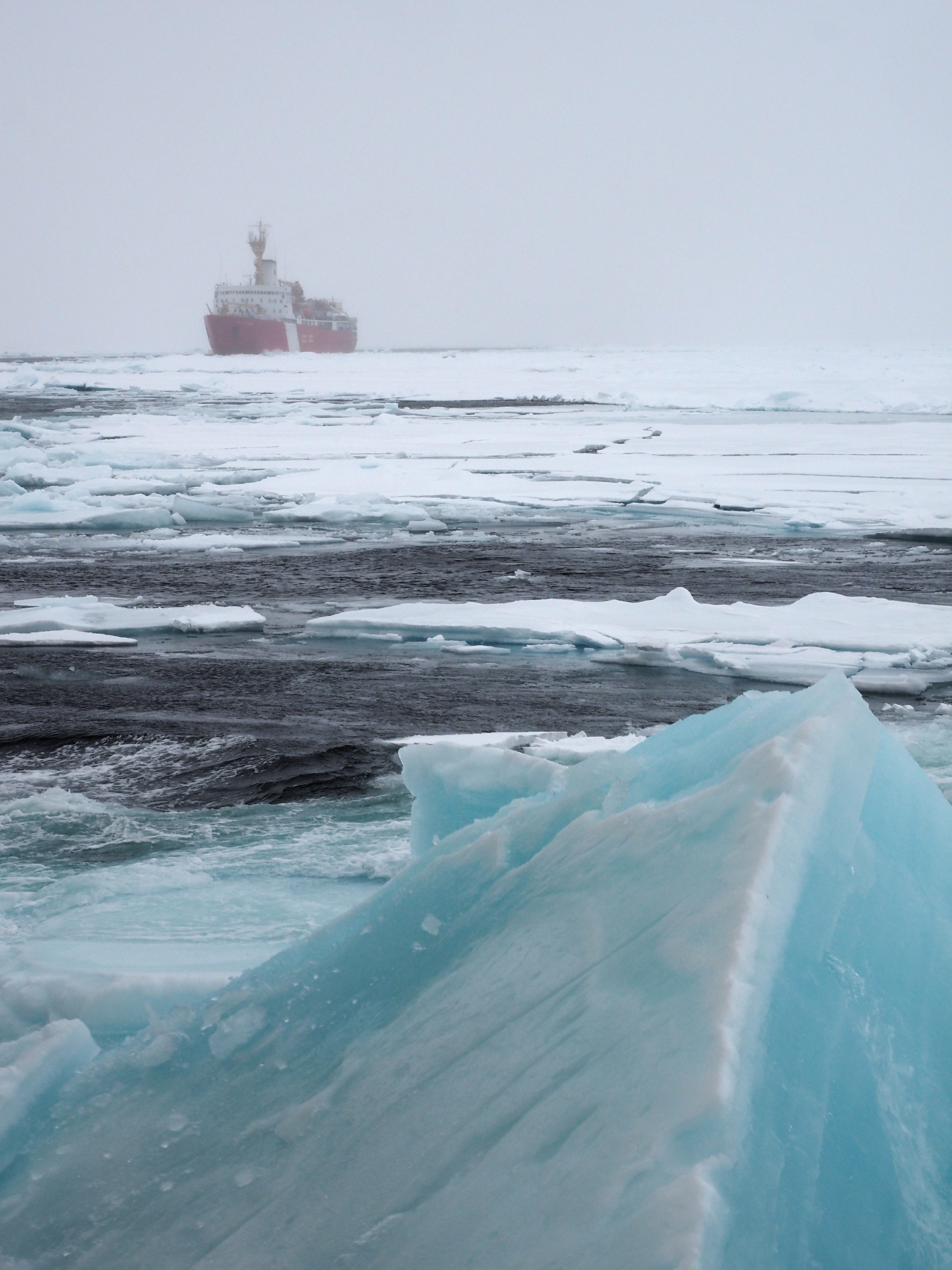 Ibland får jag hjälpa till med provtagning, vilket är det bästa sättet att verkligen förstå forskarnas arbete och resultat. För två dagar sedan fick jag följa med i helikopter till en isstation och assistera Lina Rotermund från Dalhousie University i Kanada. Själva flygningen var en hisnande upplevelse, ett nytt perspektiv på det islandskap jag betraktat i veckor. Vi flög framför Oden, som sedan åkte ikapp oss, så att hemresan skulle bli enklare och kortare. Piloten och forskarna valde en plats som både lämpade sig för provtagning och var tillräckligt säker för att arbeta på under några timmar.
