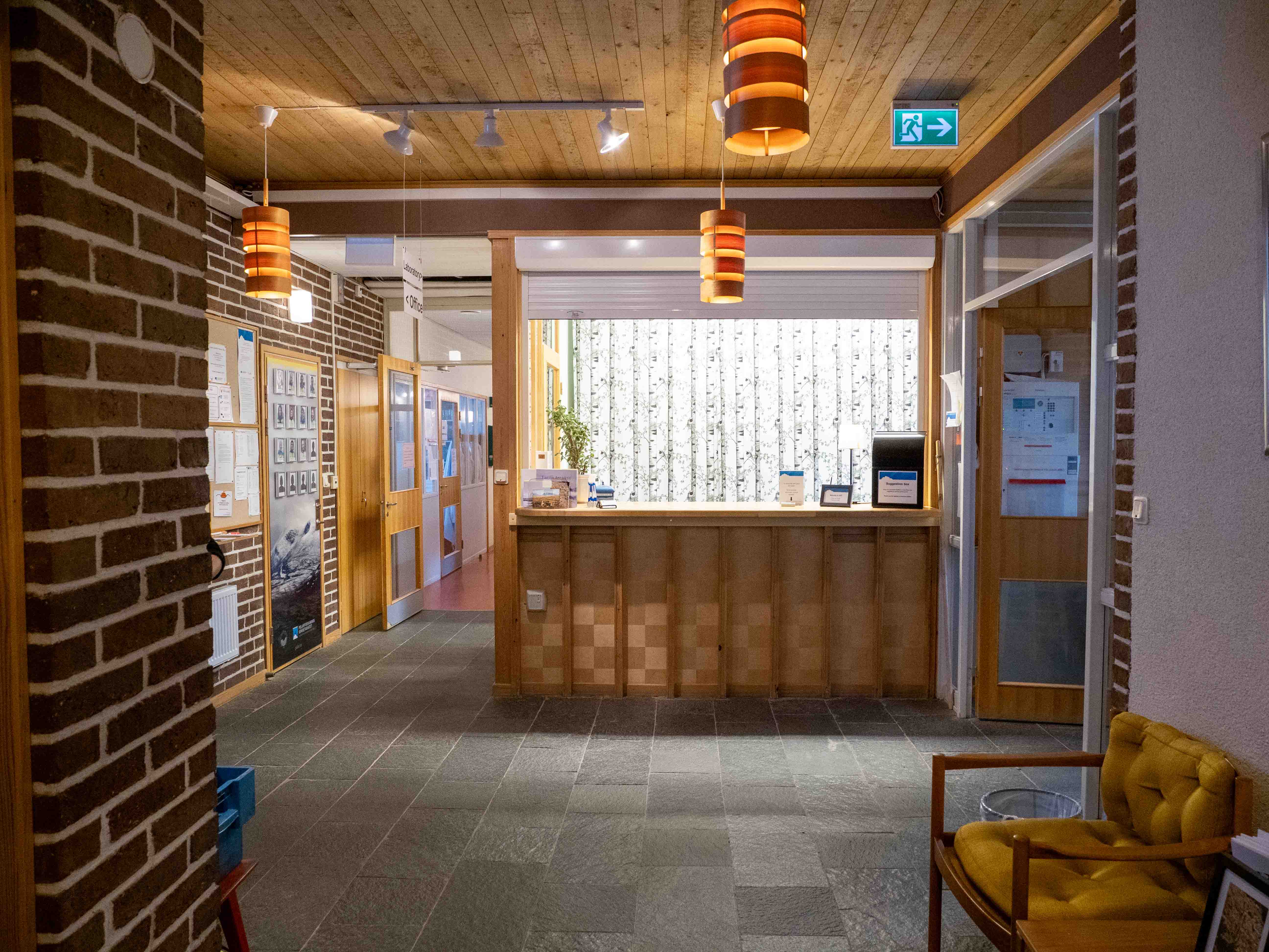 Receptionen är bemannad helgfria vardagar. Om ingen finns på plats finns här en ringklocka för att få kontakt med personalen.