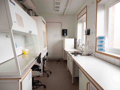 Här får endast arbete med rena och preparerade prov utföras. Detta laboratorium är avsett för arbeten som kräver dragskåp, till exempel vid hantering av starka syror och baser, flyktiga eller toxiska kemikalier eller arbeten som är kontamineringskänsliga. Lokalen är utrustat med två dragskåp och en renluftsbänk. Tillgång till extra ultrarent vatten, samt en diskbänk. Vakuumpump kan lånas till vissa typer av arbeten.
