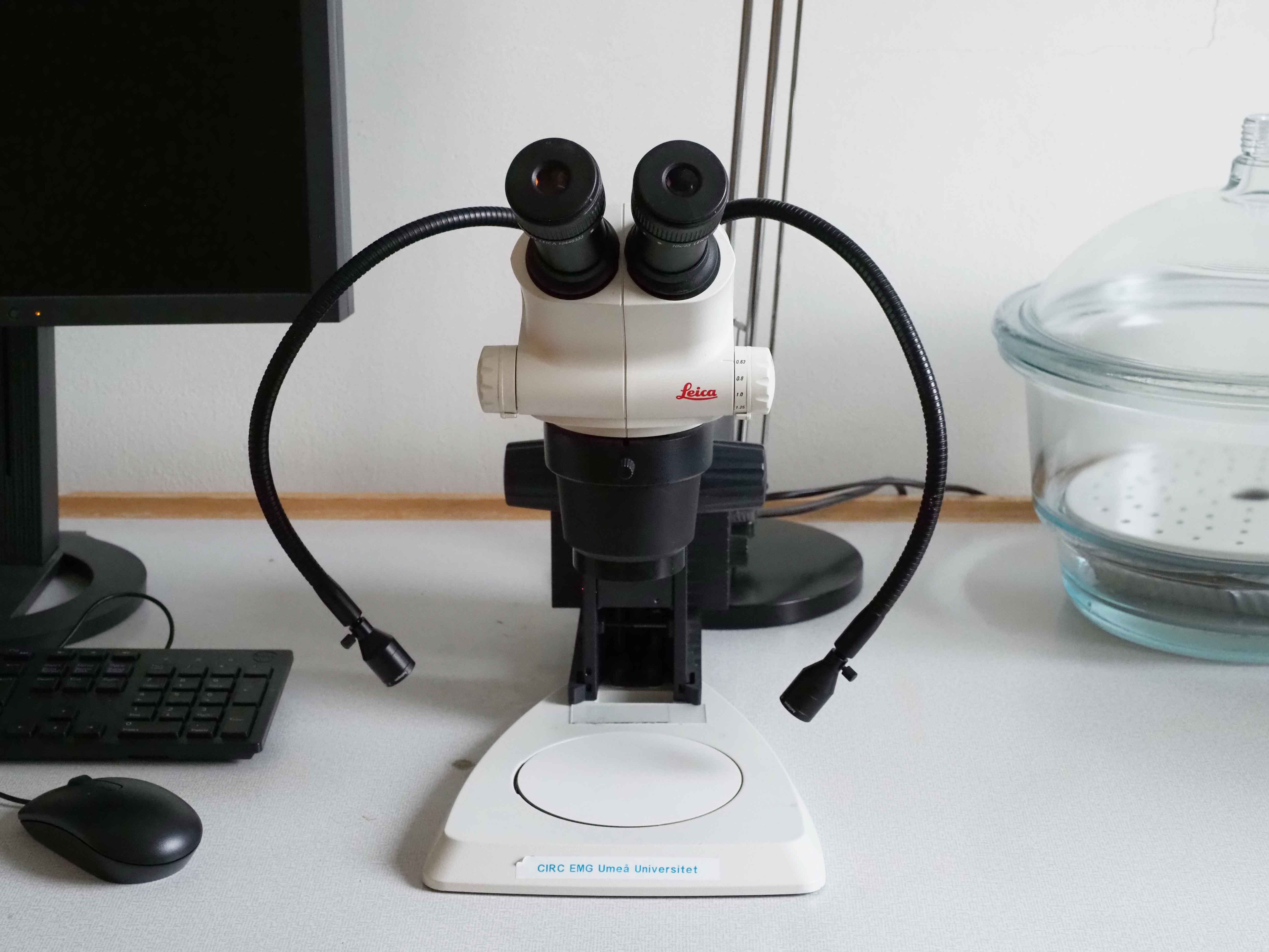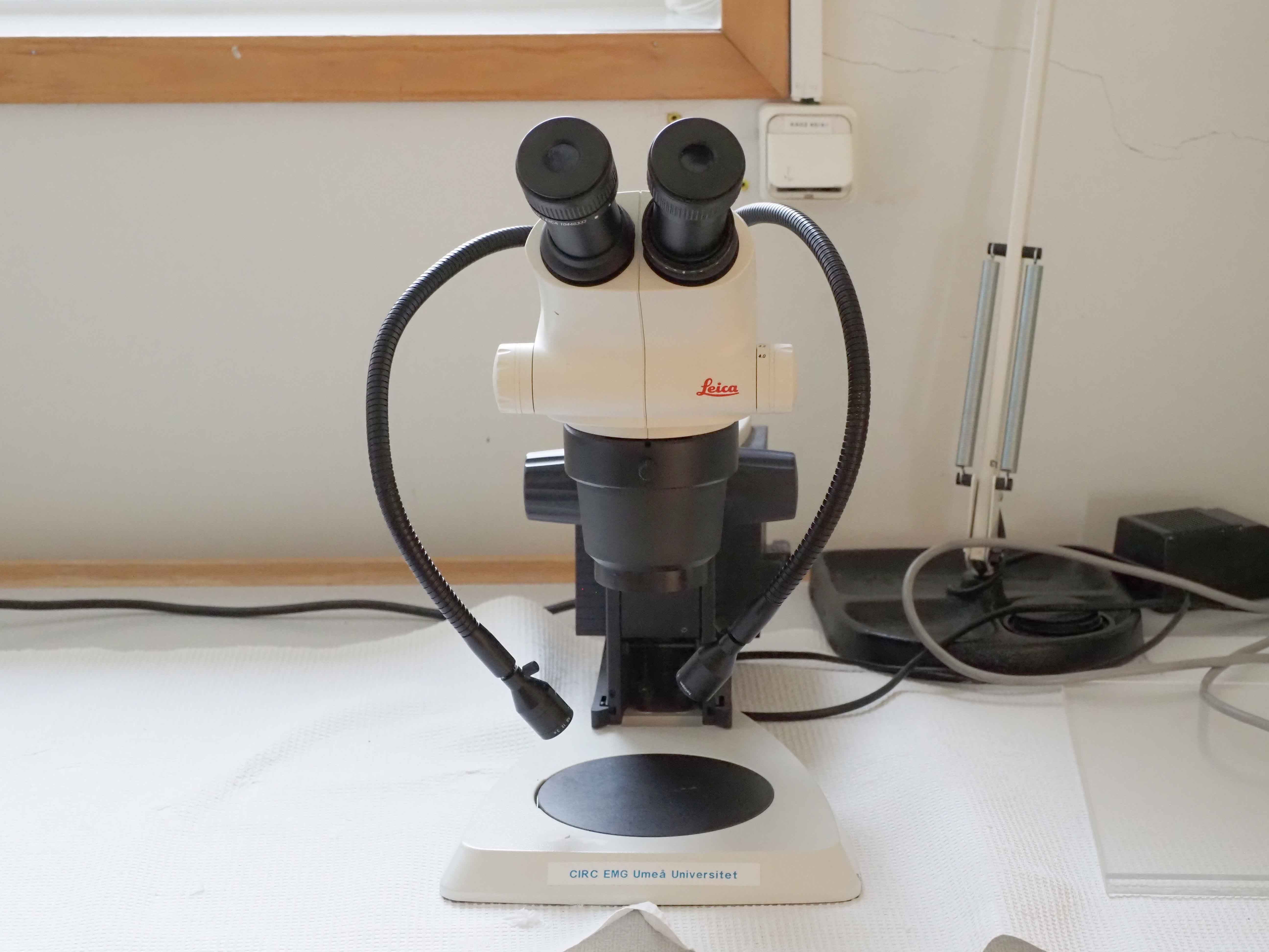 - Leica S6 E Stereo Microscope med ljusarmar (4 enheter, varav en har kamerastativ) med förstoring från 0,63 till 40 gånger (CIRC).